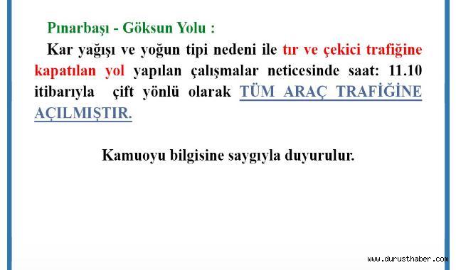 Kar yağışı ve tipi nedeniyle tır ve çekici trafiğine kapatılan Pınarbaşı – Göksun yolu, Kayseri İl Emniyet Müdürlüğü Trafik Denetleme Şube Müdürlüğü’nün bilgilendirmesine göre saat 11:10 itibarıyla çift yönlü tüm araç trafiğine açıldı.