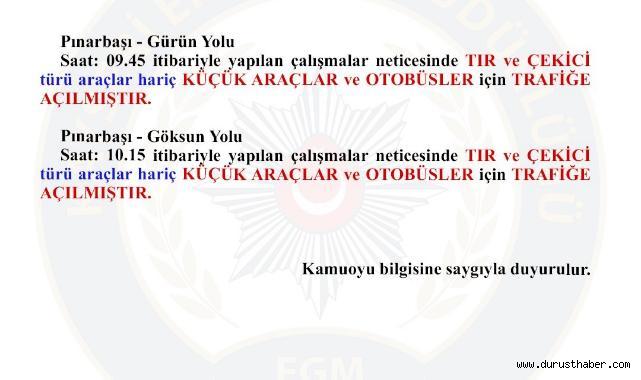 Emniyet birimlerince saat 09.45 itibarıyla yapılan duyuruya göre, Pınarbaşı–Gürün karayolu yürütülen çalışmaların ardından TIR ve çekici türü araçlar hariç olmak üzere küçük araçlar ve otobüsler için trafiğe açıldı.