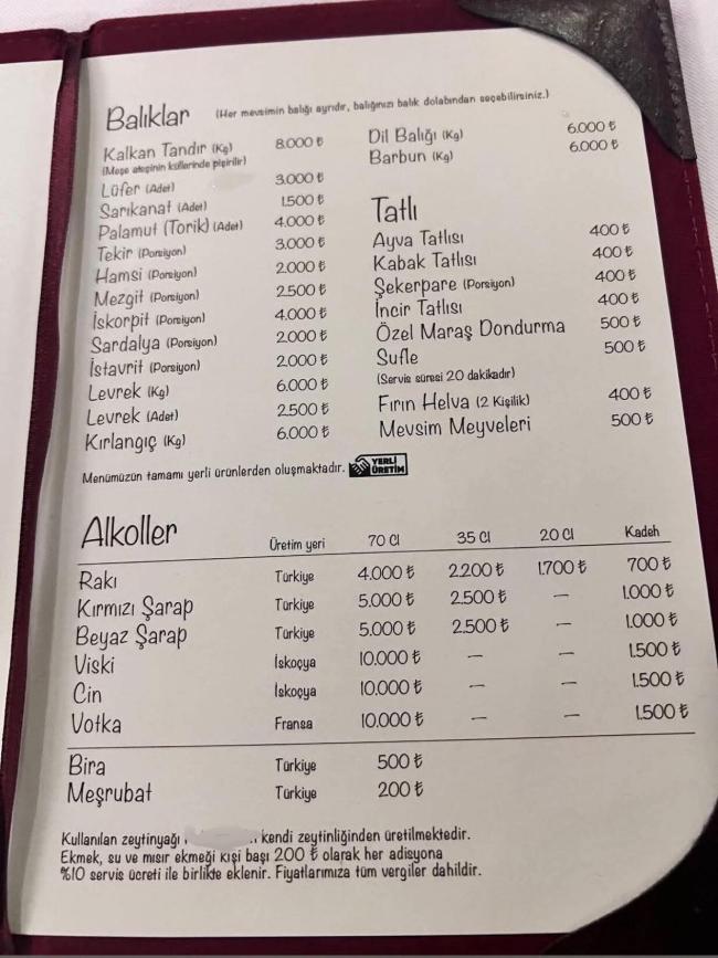 Alkollü içeceklerde ise özellikle rakı, şarap ve viski fiyatlarının yüksekliği öne çıktı. Paylaşılan menüde bazı balık türlerinin kilogram fiyatlarının 6 bin ile 8 bin lira arasında değiştiği, alkollü içeceklerde ise şişe fiyatlarının 10 bin liraya kadar çıktığı görüldü.