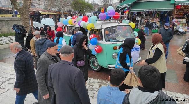 Yetim Vakfı tarafından düzenlenen etkinlik kapsamında balonlarla süslenmiş nostaljik minibüsle Fatih'ten yola çıkan gönüllüler, Eyüpsultan'a geldi.