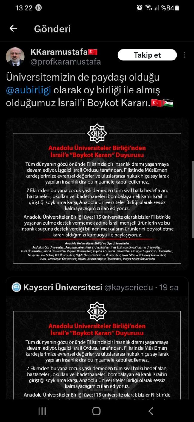 Kayseri Üniversitesi Rektörü Kurtuluş Karamustafa, sosyal medya hesabından bir paylaşım yaptı.Yaptığı paylaşımda Kayseri Üniversitesi’nin de paydaşı olduğu Anadolu Üniversiteler Birliği’nin ortak kararından söz eden Karamustafa, Anadolu Üniversiteler Birliği’ne üye olan 15 üniversitenin aldığı ortak kararı yayınladı.Alınan karara göre bahsi geçen 15 üniversitede Filistin’de yaşanan zulme destek vermemek adına İsrail menşeili ürünlerin ve bu insanlık suçuna destek verdiği bilinen markaların ürünleri artık Anadolu Üniversiteler Birliği üyesi olan üniversitelerde kullanılmayacak.