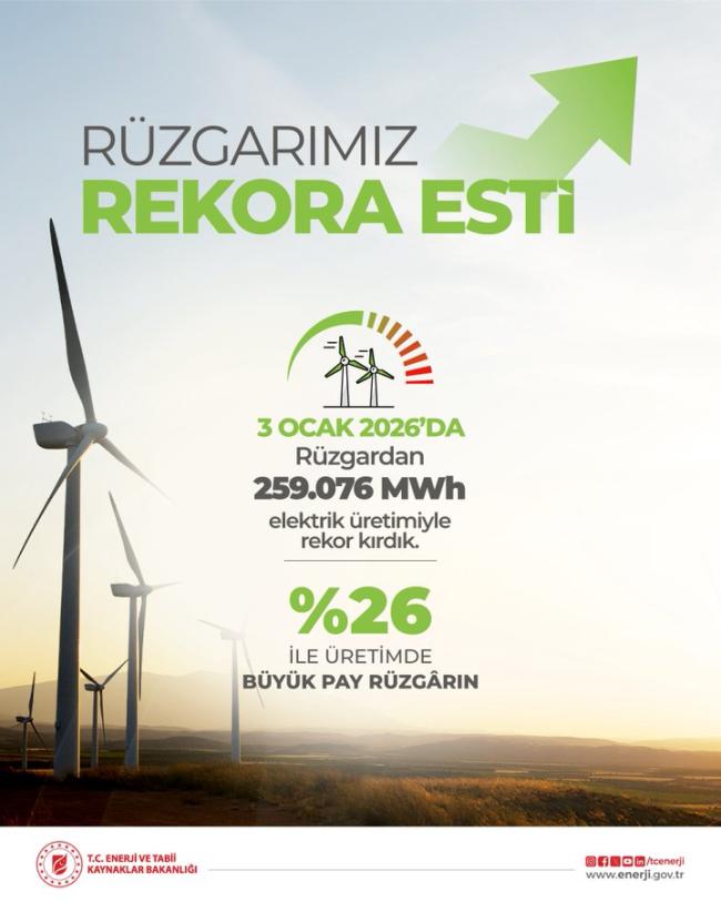 Türkiye, yenilenebilir enerji alanında önemli bir başarıya daha imza attı. T.C. Enerji ve Tabii Kaynaklar Bakanlığı tarafından yapılan açıklamaya göre, rüzgâr enerjisinde 259 bin 76 MWh üretimle tarihî bir zirveye ulaşıldı.