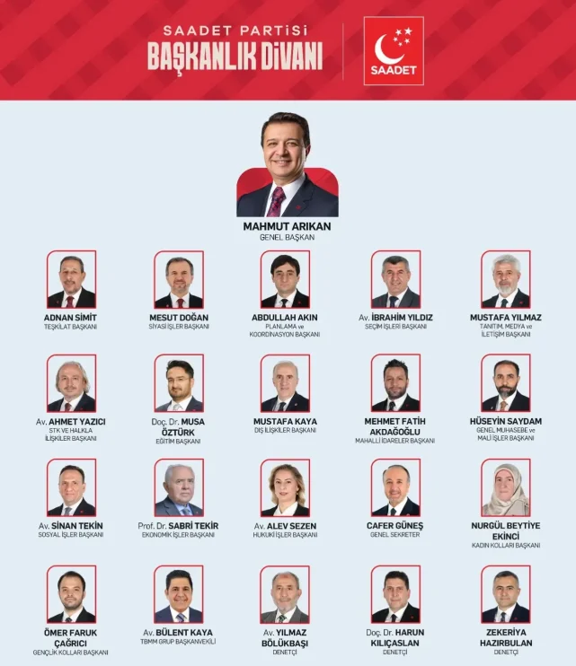 Saadet Partisi’nin yeni genel başkan yardımcıları belli oldu.24 Kasım’da Saadet Partisi Genel Başkanı seçilen Mahmut Arıkan uzun istişareler ve değerlendirmeler sonucunda yeni A Takımı’nı belirledi.MAHMUT ARIKAN: BUYURUN BAŞLIYORUZYeni başkanlık divanına ilan eden Saadet Partisi Genel Başkanı Mahmut Arıkan yaptığı açıklamada, “Yaşanabilir Bir Türkiye ve Yeniden Büyük Türkiye'yi inşa etmek için inanç ve azimle çalışacak olan yeni Başkanlık Divanı'mızın hayırlara vesile olmasını temenni ediyorum. Bir önceki Başkanlık Divanı'mızda bulunan tüm dava arkadaşlarımıza teşekkür eder; yeni üyelerimize başarılar dilerim. Allah hepimizin yar ve yardımcısı olsun. Buyurun Başlıyoruz!” ifadelerini kullandı.SAADET PARTİSİ BAŞKANLIK DİVANI