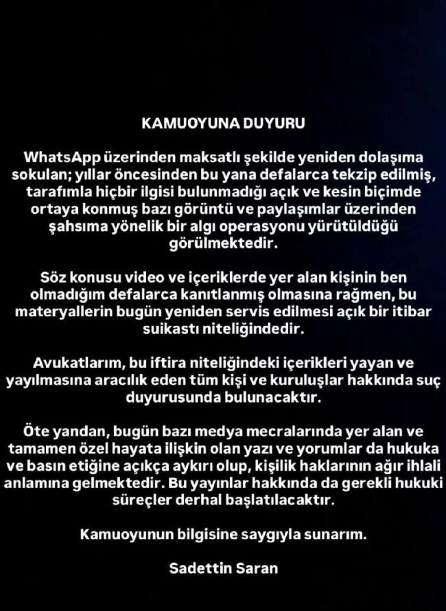 Saran, kendisi hakkında dolaşıma sokulan içeriklerin tesadüf olmadığını belirterek, planlı bir algı oluşturulmaya çalışıldığını ifade etti. Açıklamasında, özel hayatın gizliliğini ihlal eden ve basın etik kurallarını aşan yayınlara dikkat çeken Saran, bu durumun kişilik haklarını açık şekilde zedelediğini vurguladı.