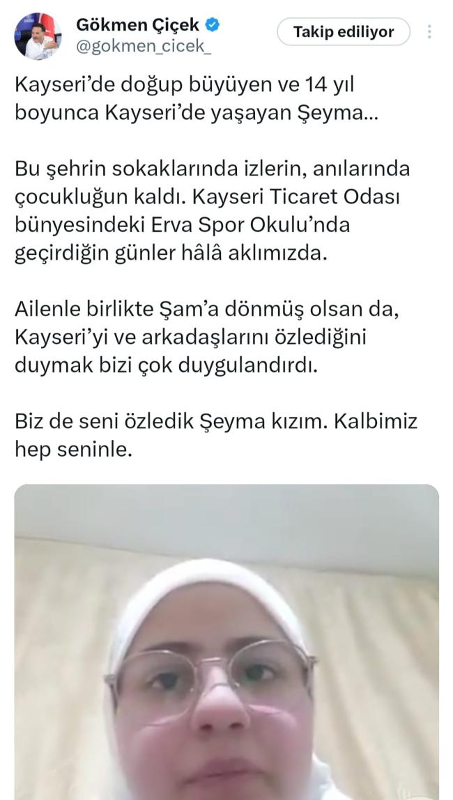 "Kayseri'de doğup büyüyen ve 14 yıl boyunca Kayseri'de yaşayan Şeyma… Bu şehrin sokaklarında izlerin, çocukluğun kaldı. Kayseri Ticaret Odası bünyesindeki Erva Spor Okulu'nda geçirdiğin günler hala aklımızda. Ailenle birlikte Şam'a dönmüş olsan da, Kayseri'yi ve arkadaşlarını özlediğini duymak bizi duygulandırdı. Biz de seni özledik Şeyma kızım. Kalbimiz hep seninle."