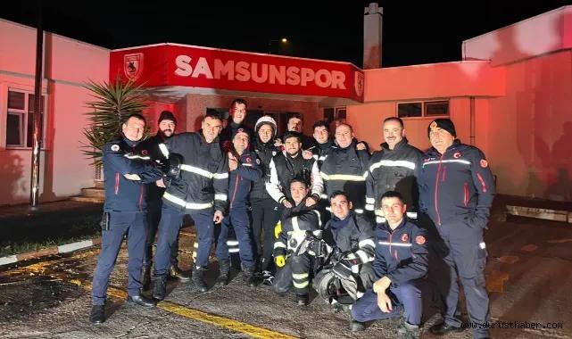 Süper Lig takımı Samsunspor'un Nuri Asan Tesisleri'nin çatısında, henüz belirlenemeyen nedenle yangın çıktı.Haber verilmesi üzerine olay yerine giden Büyükşehir Belediyesi itfaiye ekipleri, yangına müdahale etti. Ekipler, yangını kısa sürede söndürdü.İTFAİYE EKİPLERİ FUTBOLCULAR İLE FOTOĞRAF ÇEKTİRDİSüper Lig'in 14. haftasında yarın sahasında karşılaşacağı Bodrum FK maçı öncesinde tesislerde dinlenen futbolcular, yangın sırasında dışarı çıktı.İtfaiye ekipleri söndürme çalışmalarının ardından Samsunsporlu futbolcular Zeki Yavru ve Soner Aydoğdu ile fotoğraf çektirdi.