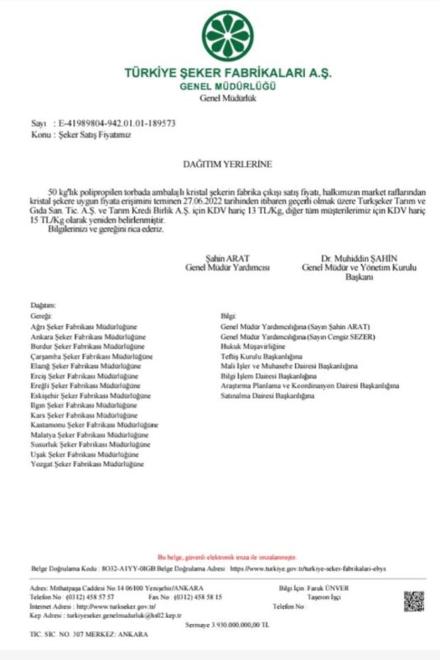TÜRKŞEKER, fiyat artışıyla ilgili şeker fabrikalarına gönderdiği yazıda şu ifadelere yer verdi: “50 kilogramlık polipropilen torbada ambalajlı kristal şekerin fabrika çıkış satış fiyatı, halkımızın market raflarından kristal şekere uygun fiyata erişimini teminen 27 Haziran 2022 tarihinden itibaren geçerli olmak üzere Türkşeker Tarım ve Gıda Sanayi A.Ş. ve Tarım Kredi Birlik A.Ş. için KDV hariç 13 TL/kg, diğer tüm müşterilerimiz için KDV hariç 15 TL/kg olarak yeniden belirlemiştir."