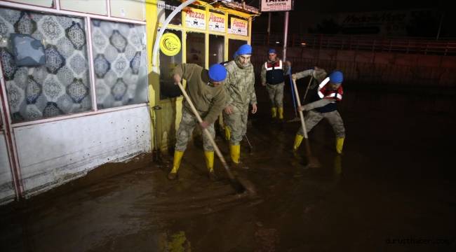 Jandarma ekipleri taşan Karakoyun deresi bölgesinde TOMA, kürek ve paspaslarla bölgedeki çamurun temizlenmesine yönelik çalışmalara destek verdi.