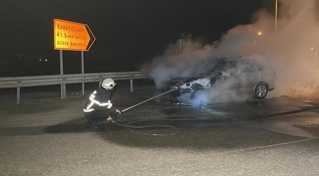 Yangın Düzce Kuzey Çevre Bağlantı Yolu’nda meydana geldi. Edinilen bilgilere göre saat 01.50 sıralarında Konuralp istikametinden Bahçeşehir istikametine seyir halinde olan Talha Salih A. idaresindeki 14 BV 757 plakalı otomobil seyir halindeyken motor kısmından bir anda alev almaya başladı. Sürücü alev topuna dönem otomobilden arkadaşları ile birlikte son anda çıkarak durumu itfaiye ekiplerine bildirdi. İhbar üzerine olay yerine gelen ekipler alevleri kısa sürede kontrol altına alarak söndürdü. Yangın sebebi ile trafik tek şeritten sağlanırken, çekici ile kaldırılmasının ardından normal seyrine döndü. Polis yangın ile ilgili inceleme başlattı.
