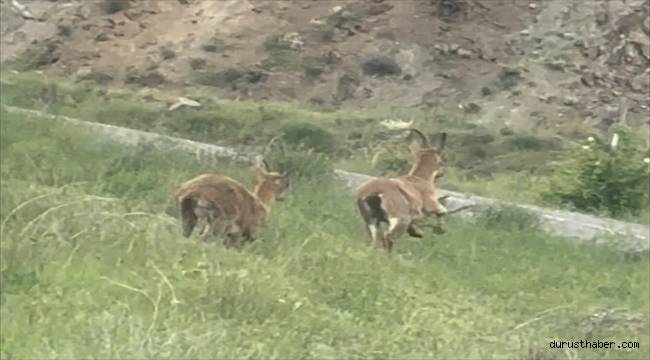 Sivas'ın Akıncılar ilçesinde dağ keçileri köy grup yolunda görüntülendi.