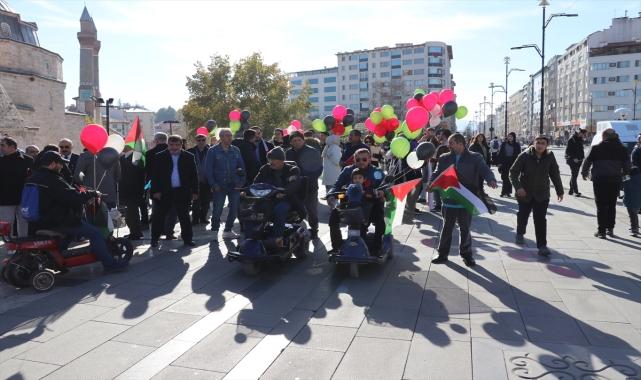 Sivas'ta engelliler ve aileleri, İsrail'in Filistin'e yönelik saldırılarını yaptıkları yürüyüşle protesto etti. İnönü Bulvarı Kale Camii önünden başlayan yürüyüşe kentteki bedensel, zihinsel ve işitsel engelli bireyler ile aileleri katıldı.Cumhuriyet Meydanı'nda son bulan yürüyüşte engelliler ve aileleri, Filistin bayrağının renklerinden uçan balon taşıdı.Engelliler adına açıklama yapan Sivas Kent Konseyi Engelliler Meclisi Başkanı görme engelli Selman Devecioğlu, "Dünya kördür ve sağırdır. Filistin'de yaşanan zulmü görmüyor. Biz de engelliler olarak dünyanın kör ve sağır oluşuna karşı ses vermeye geldik. Bizlerin kocaman yürekleri ve vicdanları var. Kimseye zulüm yapmıyoruz, bizler zalim değiliz." ifadelerini kullandı.Açıklamanın ardından uçan balonlar Filistin'in özgürlüğü için gökyüzüne bırakıldı.