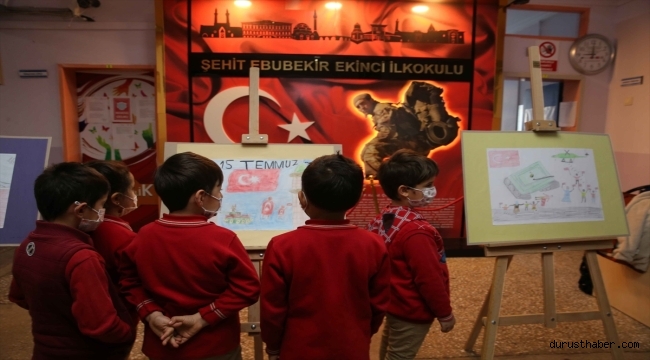Sivas'ta, Şehit Ebubekir Ekinci İlkokulu öğrencileri 15 Temmuz ve şehitler konulu resim sergisi açtı.