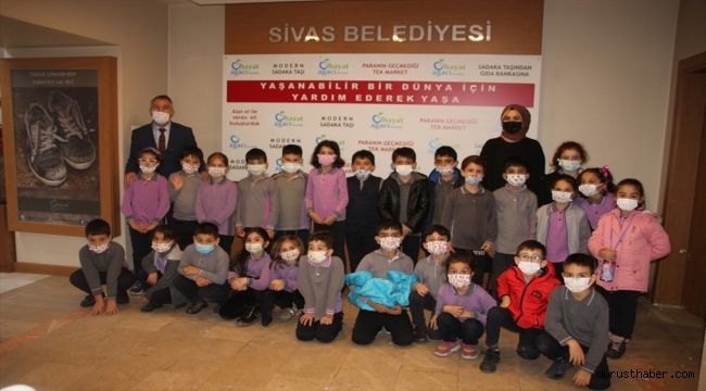 Sivas'ta ilkokul öğrencileri, düzenledikleri yardım kampanyasıyla topladıkları 900 lirayı, belediye bünyesinde ihtiyaç sahipleri için faaliyet gösteren Hayat Ağacı Derneği'ne bağışladı.
