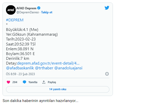 GÜNDEM Yayınlanma: 23 Şubat 2023 - 21:17 Son dakika! Kahramanmaraş'ta 4,1 büyüklüğünde deprem Kahramanmaraş'ın Göksun ilçesinde 4,1 büyüklüğünde deprem meydana geldi. GÜNDEM 23 Şubat 2023 - 21:17 TAKİP ET Yazdır A Büyüt A Küçült Yorumlar Kahramanmaraş'ın Göksun ilçesinde 4,1 büyüklüğünde deprem meydana geldi. YORUMLAR FACEBOOK adlı kullanıcıya cevap x Gönder Son Haberler Gastro Kayseri Derneği TUGAFED'e Resmen Üye Oldu İlmek, Koltuğu 23 Nisan’da Minik Başkanlara Bıraktı Cıngı: Müslümanlar Avrupa'da Yoğun Ayrımcılığa Maruz Duygun: Promosyonlar Bayramdan Önce Verilecek Melikgazi’de Kentsel Dönüşüm Hamlesi Afetzede Barınma Desteği ile ilgili merak edilenler Afetzede Barınma Desteği ile ilgili merak edilenler