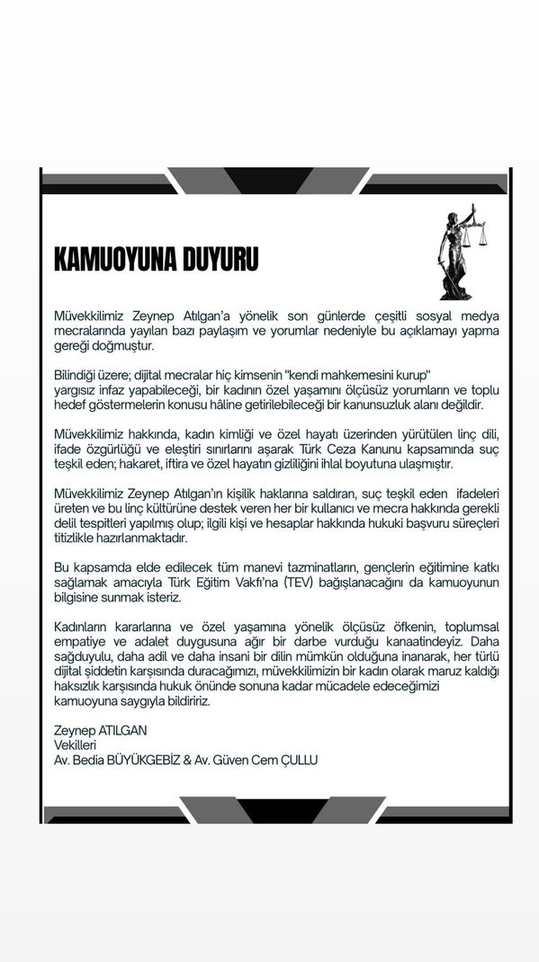 Atılgan’ın avukatları Bedia Büyükgebiz ve Güven Cem Çullu aracılığıyla yapılan açıklamada, son günlerde dijital mecralarda yapılan bazı paylaşımların ifade özgürlüğü sınırlarını aşarak hakaret, iftira ve özel hayatın gizliliğinin ihlali boyutuna ulaştığı belirtildi.