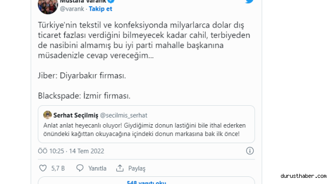 Sosyal medyada Sanayi ve Teknoloji Bakanı Varank ile kendini 'İYİ Parti Mahalle Başkanı' olarak tanıtan Serhat Seçilmiş arasında bir 'iç çamaşırı' tartışması yaşandı. Seçilmiş, Bakan Varank'ın bir paylaşımına tepki gösterdi. Varank'sa verdiği yanıtta Seçilmiş'i 'cahil' ve 'terbiyeden nasibini almamış" olarak nitelendirdi. Varank cevabında yerli iki iç çamaşırı markasını da paylaştı.Sosyal medyada platformu Twitter'da Sanayi ve Teknoloji Bakanı Mustafa Varank ile kendini 'İYİ Parti Mahalle Başkanı' olarak tanıtan Serhat Seçilmiş arasında bir 'iç çamaşırı' tartışması yaşandı. Seçilmiş, Bakan Varank'ın bir paylaşımına tepki gösterdi. Varank ise verdiği yanıtta Seçilmiş'i 'cahil' ve 'terbiyeden nasibini almamış" olarak nitelendirdi.Twitter hesabında kendini 'İYİ Parti Mahalle Başkanı' olarak tanıtan Serhat Seçilmiş adlı kullanıcı, Sanayi ve Teknoloji Bakanı Mustafa Varank'ın 2021 yılında "Biz Açtık!" notuyla paylaştığı bir videoya yanıt verdi. Bakan Varank'ın, yatırımları anlattığı videoyu paylaşan Seçilmiş, paylaşımında şu ifadeleri kullandı:"Anlat anlat heyecanlı oluyor! Giydiğimiz donun lastiğini bile ithal ederken önündeki kağıttan okuyacağına içindeki donun markasına bak ilk önce!"
