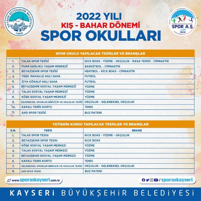 Belediyeden yapılan yazılı açıklamaya göre, Spor AŞ, sporseverlerin hizmetine sunulan kış dönemi spor okulları kurs programı kapsamında futboldan basketbola, okçuluktan tenise, yüzmeden kick boksa 11 dalda kurs hizmeti ile spor desteği verecek.3'üncü kış dönemi spor okullarında branş ve yaş aralıkları yetişkin kursları için 16-65, jimnastik için 4-10, yüzme için 6-13 ve buz pateni için 4-15 yaş, futbol, basketbol, hentbol, tenis, masa tenisi, okçuluk, geleneksel okçuluk ve kick boks için ise yaş aralığı 7-15 olarak belirlendi.