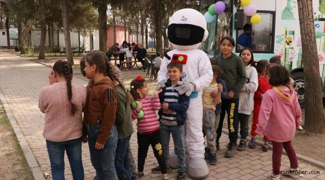 Burada astronot kostümlü görevli ile keyifli zaman geçiren çocuklar, sanal gerçeklik gözlüğü, ahşaptan maket uçak, bardaktan kule yapımı ve boyama gibi birçok etkinlikle deprem psikolojisini atlatmaya çalışıyor.