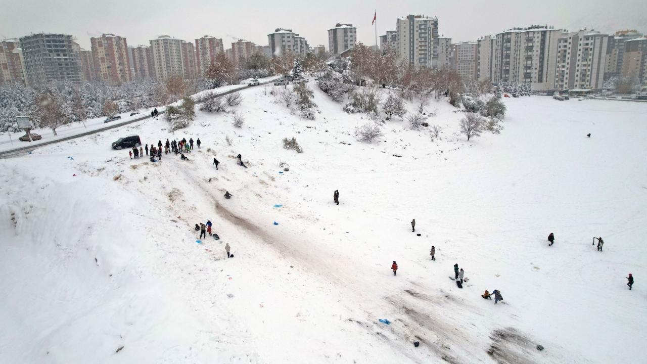 Her yaştan insanın akın ettiği alanda, eline geçirdikleri tüm malzemelerle tepeden aşağıya kayan çocuklarla birlikte büyükler de eğlencenin keyfini çıkardı.