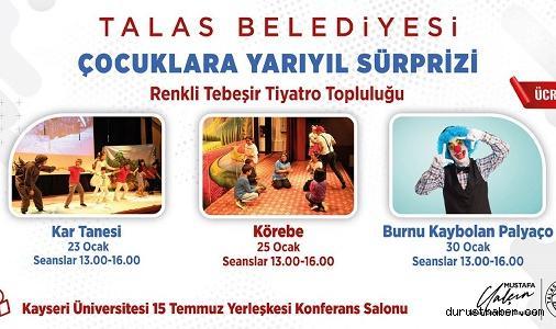 Okulların yarıyıl tatiline girerek eğitime ara vermesiyle birlikte Talas Belediyesi de çocuklara unutamayacakları, eğlenceli bir karne hediyesi hazırladı. Yarıyıl tatili boyunca devam edecek etkinliklerde “Renkli Tebeşir Tiyatro Topluluğu” tarafından hazırlanan tiyatro gösterileriyle çocuklara unutulmaz bir tatil anısı sunulacak.Kayseri Üniversitesi 15 Temmuz Yerleşkesi Konferans Salonu’nda gerçekleşecek organizasyonda ilk olarak 23 Ocak Salı Günü “Kar Tanesi” isimli çocuk tiyatrosu sergilenecek. Daha sonra 25 Ocak Perşembe Günü ise “Körebe” isimli tiyatro oyunu çocuklarla buluşacak. Ara tatilin son etkinliği ise 30 Ocak Salı Günü gerçekleşecek olan “Burnu Kaybolan Palyaço” isimli çocuk gösterisi olacak.2 seans halinde gerçekleşecek etkinliklerin ilk seansı saat 13.00’te ikinci seansı ise 16.00’da başlayacak. Talas Belediyesi’nin daha önceki etkinliklerinde olduğu gibi bu etkinliklerin tamamı da ücretsiz olacak.