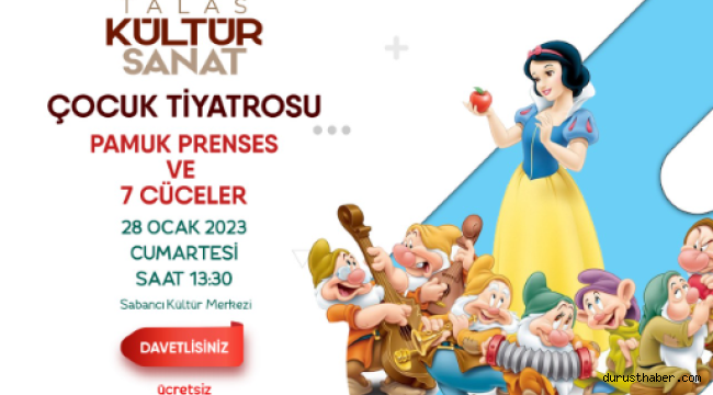 Ocak ayı Talas Kültür Sanat etkinlikleri, bu hafta sonu gerçekleşecek ‘Pamuk Prenses ve 7 Cüceler’ adlı çocuk tiyatrosuyla sona erecek.
