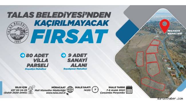 Talas Belediyesi Reşadiye ve Başakpınar’da bulunan 89 parça taşınmazı satışa çıkardı. Açık arttırma usulü ile gerçekleştirilecek satışlardan elde edilecek gelir, Talas Belediyesi’nin yapacağı hizmet ve yatırımlarda kaynak olarak kullanılacak.7-8 Aralık 2022 tarihlerinde Belediye Meclis Salonu’nda düzenlenecek ihale ile Reşadiye Mahallesi sınırlarında yer alan 80 adet konut arsası ile Başakpınar Mahallesinde yer alan 9 adet sanayi alanı satışa sunulacak.