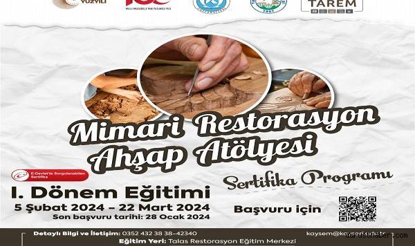 Merkezin mimari restorasyon ahşap, demir ve taş atölyesi birinci dönem sertifikalı eğitim programlarına kayıtlar 28 Ocak’ta sona erecek. 5 Şubat-22 Mart arasındaki ilk dönem eğitim programına kayıt yaptırmak isteyenler www.kaysem.kayseri.edu.tr adresinden veya 0352 432 3838-42340 numaralı telefondan detaylı bilgi alabilir.