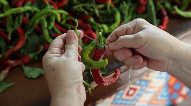 Edirne mutfağının ünlü lezzeti tava ciğerinin garnitürü olan Karaağaç acı biberinin iplere dizilmesine ve kurutulmasına başlandı.