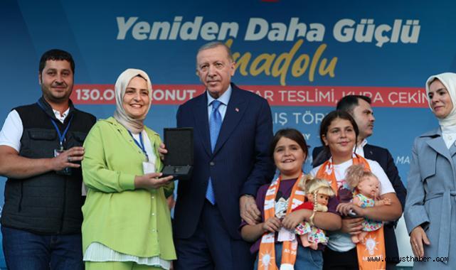 Depremin hemen ardından 3 ay gibi kısa bir sürede 180 bin konutun yapımına başladıklarını anımsatan Erdoğan, "Böylece 11 ilimizi dünyanın en büyük şantiye sahasına dönüştürdük. Bugün deprem bölgemizde 1900 şantiyede ve 4 bin 333 köyümüzde 160 bin mimar, mühendis ve işçi kardeşimiz canla başla çalışıyor. Şu ana kadar 350 bin 430 konut ve iş yerimizin ihalesini gerçekleştirdik. Bunlardan 18 bin 404'ü Hatay'da olmak üzere 101 bin 254 tanesini teslim ettik." dedi.Alandaki vatandaşlara "Hazır mısınız?" diye seslenerek "Tek vatan, tek bayrak, tek devlet. Bir olacağız, iri olacağız, diri olacağız. Hep beraber kardeş olacağız." diyen Erdoğan, şöyle devam etti:"Bugün Hatay'ımızda 7 bin 856, Malatya'mızda 6 bin 759, Gaziantep'imizde 5 bin 259, Kahramanmaraş'ımızda 3 bin 135, Adıyaman'ımızda 3 bin 108, Adana'da 648, Diyarbakır'ımızda 641, Elazığ'ımızda 569, Şanlıurfa'mızda 17, Kilis'imizde 9, Osmaniye'mizde 1310 olmak üzere toplamda 29 bin 311 yuvamızın daha kuralarını çekerek hak sahiplerine teslim ediyoruz. Böylece 130 bininci afet konutumuzun anahtarlarını depremzedelerimize teslim etmenin bahtiyarlığını yaşıyoruz."Cumhurbaşkanı Erdoğan, yeni evlerin depremzedeler için hayırlı, uğurlu olmasını diledi."Deprem bölgesinde evine girmeyen hiçbir hak sahibimiz kalmayacak"Hatay'da toplam 152 bin 959 hak sahibi olduğu bilgisini veren Erdoğan, şunları söyledi:"11 ilimizde ise toplam 442 bin 709 hak sahibi bulunuyor. Bu yılın sonuna kadar 201 bin 688 ev ve iş yerimizin daha anahtarlarını sahiplerine teslim edeceğiz. 2025 yılı sonunda 452 bin 958 konut, iş yeri ve ahırı teslim etmiş olacağız. Deprem bölgesinde evine girmeyen hiçbir hak sahibimiz kalmayacak. Bir defa şunu çok açık ve net söylemek isterim. Biz meydanlarda verdiği sözü göreve gelince unutanlardan değiliz. Biz ahdine, vadine, millete verdiği sözlere sadık bir yönetimiz. Biz 'bir şeyi yapacağız' dersek, Allah'tan bir mani olmazsa yaparız."Erdoğan, Çevre, Şehircilik ve İklim Değişikliği Bakanlığının yanı sıra AFAD, Kızılay, belediyeler ve sivil toplum kuruluşlarının da şehirleri ayağa kaldırmak için uğraştığına işaret ederek, "AFAD vasıtasıyla Hatay'a yaptığımız nakdi yardımların toplamı nedir biliyor musunuz? 36 milyar 150 milyon lirayı aştı. İmece usulüyle Hatay'ın ihtiyaçlarını gidermek için devlet-millet el ele vermiş durumdayız. Hataylı kardeşlerim bu konuda gönüllerini ferah tutsun. Deprem bölgemiz sanayisiyle, ticaretiyle, üretimiyle, kültürel zenginliğiyle yeniden ayağa kalkana kadar buradan asla ayrılmayacağız." diye konuştu.Depremde vefat edenlere bir kez daha Allah'tan rahmet, yakınlarına sabır dileyen Erdoğan, evlerin yapımında alın teri döken mimar, mühendis, işçi ve kurumları da tebrik etti.Erdoğan, "Aynı şekilde Hataylı kardeşlerimizin bir an önce yeni hayatlarına başlaması için desteklerini esirgemeyen savunma sanayimizin gururu Baykar'a, Doğuş Grubuna, Türkiye İş Bankasına ve tüm hayırseverlere en kalbi şükranlarımı sunuyorum." dedi."Mazimiz dünyada eşi benzeri bulunmayan nadide bir hazinedir"
