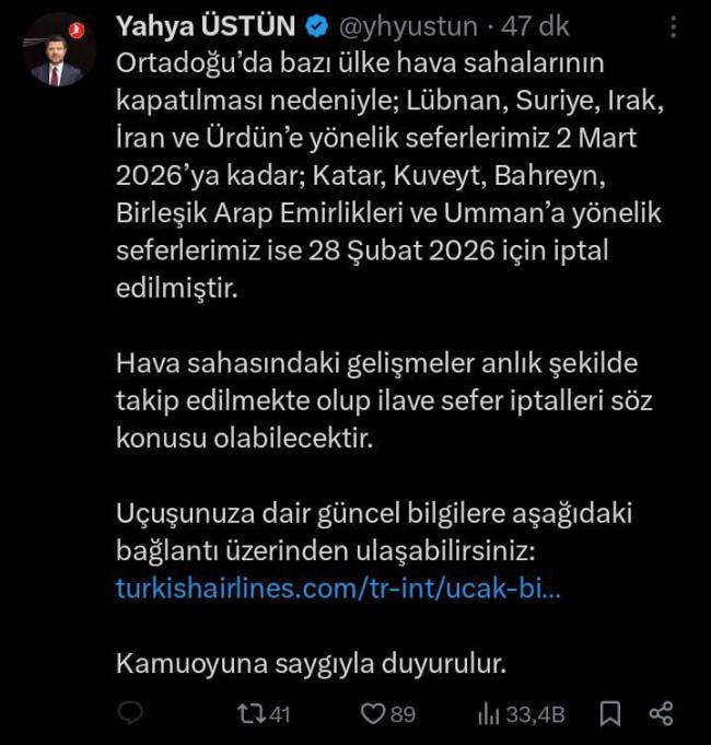 THY İletişim Başkanı Yahya Üstün, yaptığı açıklamada, Lübnan, Suriye, Irak, İran ve Ürdün’e yönelik seferlerin 2 Mart 2026’ya kadar, Katar, Kuveyt, Bahreyn, Birleşik Arap Emirlikleri ve Umman’a yönelik seferlerin ise 28 Şubat 2026 için iptal edildiğini duyurdu.
