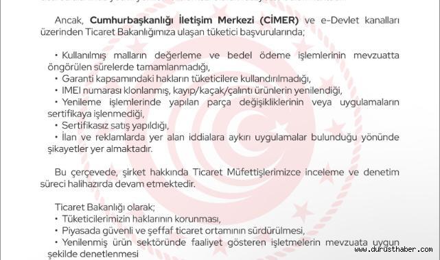 Tüketici şikayetleri üzerine yürütülen incelemeler sürüyor; Bakanlık, yenilenmiş ürünlerde güvenli ve şeffaf ticaretin sağlanacağını bildirdi.