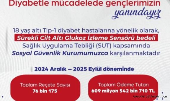 “18 yaş altındaki Tip 1 Diyabet hastası evlatlarımız için sürekli cilt altı glukoz izlem cihazlarını Sosyal Güvenlik Kurumumuz aracılığıyla geri ödeme kapsamına almıştık. 2024 yılı Aralık - 2025 yılı Eylül arasında; 610 milyon liraya yakın ödeme bedeli olan 76 binden fazla reçeteyi evlatlarımız için karşıladık. 23 yıldır attığımız her adımda milletimizin iyiliğini ve toplumumuzun yararını önceledik. Bundan sonrasında da bu gayretle çalışmaya devam edeceğiz.”