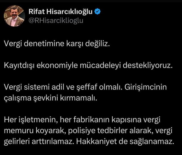 Türkiye Odalar ve Borsalar Birliği (TOBB) Başkanı Rifat Hisarcıklıoğlu, sosyal medya hesabı üzerinden yaptığı açıklamada Vergi denetimlerine karşı olmadıklarını belirterek, kayıt dışı ekonomiyle mücadelenin önemine dikkat çekti.