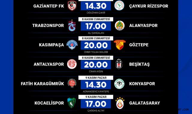 8 Kasım Cumartesi: 14:30 Gaziantep FK – Çaykur Rizespor / 17:00 Trabzonspor – Corendon Alanyaspor / 20:00 Kasımpaşa – Göztepe / 20:00 Hesap.com Antalyaspor – Beşiktaş