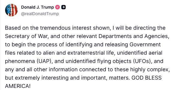 Trump, sosyal medya hesabından yaptığı paylaşımda, kamuoyunun yoğun ilgisi nedeniyle UFO ve UAP konularındaki resmi belgelerin erişime açılması sürecini başlatacağını duyurdu.
