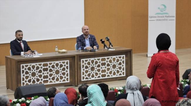 Özgeçmişi hakkında öğrencilere bilgi veren Bilal Erdoğan, insanlığın kanununda her gelen neslin bir önceki nesli beğenmediğinin olduğunu ancak kendisinin konuşulanların aksine günümüzün gençlerini çok iyi gördüğünü ifade etti.Bugünün gençlerinin "doğrucu" ve "sorgulayıcı" olduğunu dile getiren Erdoğan, şöyle konuştu:"Bugünün gençlerinin en büyük imtihanı sosyal medya kaynaklı yüzeysellik. Yani derinlemesine olmayan, işte bir sloganla, bir cümleyle birisinin ortaya attığı bir lafla kanaat oluşturma riski. Bu riskle karşı karşıyasınız. Bu riske karşı da uyanık olmanız lazım. Yani elimize bir, iki telefonu aldığımız zaman veya tableti aldığımız zaman 'ben artık özgürüm, bilginin bütün kaynaklarına erişebiliyorum, kimse beni manipüle edemez' algısına kapılmaması gerekiyor çünkü bunlar da bizi manipüle etmek için var. Kimisi malını bize satmak için kimisi de kanaatlerimizi şekillendirmek için bunları kullanıyor. İşte Hollywood da bunların filmini yaptı. Sonra bunların gerçekleri yaşandı. Amerika'da yaşandı, Avrupa'da yaşandı. Yani bununla ilgili sanmayın ki birileri size özgürlük algısını empoze ederken sizi manipüle etmeye çalışmıyor. Dolayısıyla buna karşı daha uyanık olmanız gerekiyor.""Geleneksel okçuluk hobi olmaktan çıktı"Bilal Erdoğan, okçuluk sporuna karşı ilgisinin nasıl başladığını ve kurucusu olduğu Okçular Vakfının çalışmalarıyla ilgili de öğrencilere bilgiler verdi.Okçular Vakfındaki çalışmalarına 2012 yılında başladığını anlatan Erdoğan, şöyle devam etti:"Türkiye'de okçuluk, Okçular Vakfından önce bir de Okçular Vakfından sonra diye ikiye ayrılmalı. Okçular Vakfı en az Türkiye'nin Okçuluk Federasyonu kadar bir enerji kattı Türkiye'de okçuluğa. Geleneksel okçuluğu bir hobi olmaktan çıkardı. Bir disipline çevirdi. Artık federasyonu olan, lisanslı sporcuları olan, müsabakaları olan bir spor dalı haline getirdi. Olimpiyat okçuluğu ve makaralı yay okçuluğunda da Türkiye her geçen yıl uluslararası madalya, uluslararası müsabaka başarısında zirveye tırmanmaya devam ediyor. İşte en son en büyük başarımız ilk defa okçulukta olimpiyat madalyası alındı. Hem de bunu altın olarak aldık. Mete Gazoz, klasik yayla erkeklerde olimpiyat altın madalyasını aldı. Şu anda Türkiye okçulukta dünyada ilk 5'te, Allah'ın izniyle bu ivmelenmeyle biz Güney Kore'nin yerini alacağımızı düşünüyoruz."Babası Cumhurbaşkanı Recep Tayyip Erdoğan'ın siyasi hayatı ve aile ilişkileri hakkında da gençlere bilgiler veren Bilal Erdoğan, şunları kaydetti:"Bugün hakikaten Cumhurbaşkanı'mızın dünya çapındaki saygınlığını, dünyadaki ağırlığını, yerini düşündüğümüz zaman hamdolsun diyoruz. Yani ülkemizin başına gerçekten bu millete yaraşır bir lider geldiği için, bu milletin değerlerini taşıyan, bu milletin hukukunu koruyan bir lider geldiği için hamdolsun diyoruz. Biz de çocukları olarak, ailesi olarak, bunun için 'ya işte akşam yemeğine niye gelmiyor, sabah efendim niye gidiyor, niye az görüyoruz, niye beraber bir şey yapamıyoruz?' diye sorgulamamayı, buna kızmamayı, üzülmemeyi, çok öncelerden öğrendik. Dolayısıyla hatta 1988-1989 yıllarında ilk defa Refah Partisi Kadın Kolları kuruldu. Ondan sonra anne de gitti ama biz babaannemle yan yana dairelerimizde dedem rahmetli olmuştu, babaannem bakardı, ederdi. Yani bir şekilde görev bölüşümüyle bu işler yönetilirdi ve hamdolsun biz de şimdi sivil toplum kuruluşları aracılığıyla, işte nasıl gençlerimizin eğitimde daha büyük işler yapmalarını, kendilerine daha büyük hedefler koymalarını sağlayabiliriz buna kafa yoruyoruz."Erdoğan, programda gençlerin sorularını da cevaplayarak onlara kitap hediye etti.Programa Osmaniye Valisi Erdinç Yılmaz, AK Parti Osmaniye Milletvekili İsmail Kaya, Eğitime Destek Platformu İl Koordinatörü Talha Akif Gürbüz, kurum müdürleri ve öğrenciler katıldı.