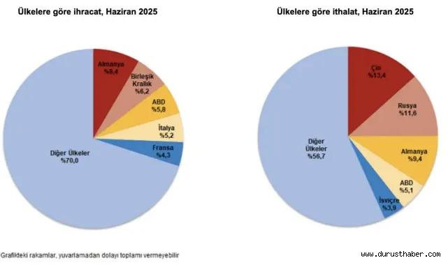 Haziran ayında en fazla ihracat yapılan ülke 1 milyar 728 milyon dolar ile Almanya olurken, onu Birleşik Krallık, ABD, İtalya ve Fransa takip etti. Bu beş ülkeye yapılan ihracat toplam ihracatın yüzde 30’unu oluşturdu. Aynı dönemde ithalatta ilk sırayı Çin aldı. Çin'den yapılan ithalat 3 milyar 831 milyon dolar olurken, Rusya, Almanya, ABD ve İsviçre onu takip etti. Bu ülkelerden yapılan ithalat toplam ithalatın yüzde 43,3’ünü oluşturdu.