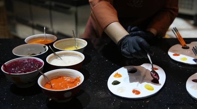 Her yıl çok sayıda turiste yeme içme hizmeti sunulan restoranda elde edilen atık malzemelerin geri dönüşümü sağlanırken ortaya sanatsal aktiviteler de çıkıyor.Çay ve kahve posasından gıda atıklarına her şeyin değerlendirildiği restoranda, içeriğinde kalsiyum bulunmasından dolayı yumurta kabukları yemle karıştırılıp tavuklara verilirken aynı zamanda otel bahçesindeki domates fidelerine gübre olarak atılıyor. Restoranda görevli aşçıların yemek hazırlıklarında ortaya çıkan atık sebze ve meyve parçaları, "boya ve tat" etkinliği için karıştırıcıda püre haline getirilip, zeytin yağı ile kıvamlandırılıyor.Ortaya çıkan doğal boyalar resim paletlerine konulduktan sonra fırçalarla konuklara dağıtılıyor.Yeteneklerini ortaya çıkaran turistler, doğal boyalarla tabaklara resim yapıp, çalışmalarını tüketebiliyor. Bölük, AA muhabirine, patentini aldığı "Yaşayan Mutfak" uygulamasının, otellerdeki her şey dahil sistem ve bilinçsiz tüketime dikkati çekmek için başlattığını belirtti.Konukların atıksız ve çevreye duyarlı etkinliklerle hem eğlenip hem de projeye destek verdiğini anlatan Bölük, şöyle konuştu:"Yaşayan Mutfak'ın, üç temel prensibi; misafire dokunmak, sürdürülebilir turizm ve sıfır atık. Sıfır atık çok önemli, artık zorunluluk haline geldi. Mutfakta çalışırken artan meyve sebze parçalarından doğal sos ve püre yapıyoruz. Misafirlerimiz bunlarla 'boya ve tat' aktivitesinde resim yapıyor. Bunu yaparken de çok eğleniyorlar. Havuç, kereviz gibi bütün sebze ve meyvelerin kullanılmayan noktalarını çok az zeytin yağı ve ayçiçek yağı ile kıvamını ayarlayıp karıştırıcıda çekiyoruz. Sonra paletlere konulup misafirlere veriliyor. Bilim insanlarına göre, dünya yaratıldığından beri ilk defa bu dönemde insanoğlunun atıkları, bütün canlıların ağırlığından fazla bir hale geldi. Artık sıfır atık zorunlu bir hal aldı. Bunu yaygınlaştırmak, yetecek kadar tüketmek çok önemli. Bizim yaktığımız bu kıvılcımın ileride ateşe dönüşeceğine inanıyorum. Bununla ilgili toplum da bilinçlenmeye başladı.""Doğa en büyük sanata aracı"Etkinliğe katılan Rus turist Selbii Baltayeva de doğal boya ile çizdiği resmin tadına baktığını, sebze ve meyvelerin israf olmasının önüne geçilmesinin memnuniyet verici olduğunu ifade ederek, "Bu tecrübeyi yaşadığım için çok mutluyum. Çünkü doğa ile neler yapılabileceğine dair bir şeyler öğrendim. Püre ile beklenmedik bir sanat ortaya çıkarılabileceğini görüyoruz. Doğa en büyük sanata aracı oluyor. Burada arkadaşlarımla hem atıklardan resim yaptık hem de resmin tadına baktık." diye konuştu.Fransa'dan gelen Nazha Regregui ise "Burada geri dönüşüm konsepti ve malzemeleri var. Yemekleri atmıyorlar ve bunu çizimlerde kullanılmasını sağlıyorlar. Çok hoş bir deneyim yaşadım. Patates, domates, havuç atıklarından çiçek çizdim. Çok doğal ve sıfır atık." dedi.Ailesiyle otelde konaklayan Selim Gültekin de resim yapmaktan keyif aldığını belirterek, "Bir boyanın yenmesi ve dönüştürülmesi çok güzel. Boyalar oldukça doğal ve harika. Aslında karakalemim çok iyi, birçok çalışmam var ama ilk defa böyle bir boya ile çizdim." ifadelerini kullandı.Endonezyalı Kadek Dwiwidiadnyani de tadına bakabildiği bir boya ile resim yapmanın eğlenceli olduğunu söyledi.