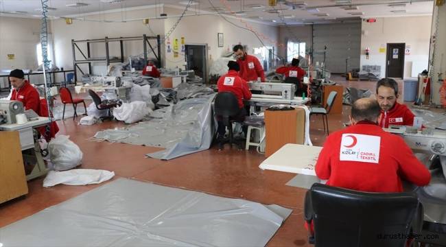 Kahramanmaraş merkezli 10 ili etkileyen depremlerin ardından Türk Kızılay Erzincan Çadır Üretim Atölyesi'nde yoğun çalışma yürütülüyor.