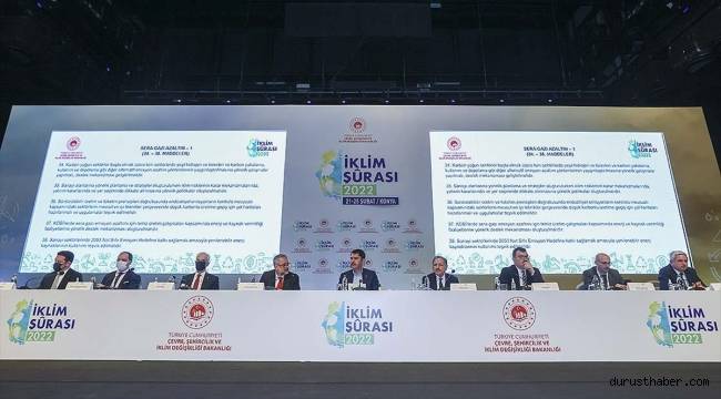 Çevre, Şehircilik ve İklim Değişikliği Bakanlığı 21-25 Şubat'ta Konya'da düzenlenen Türkiye'nin ilk İklim Şurası'nda bilim insanlarından çiftçilere, kamu kurumları ve özel sektörden sivil toplum kuruluşlarına, yerel yönetimlerden iklim elçilerine kadar çok sayıda katılımcı yer aldı. Şura sonunda iklim değişikliğiyle mücadele kapsamında 2053 net sıfır emisyon ve yeşil kalkınma hedefleri doğrultusunda, "İklim Uyumlu Şehirler", "İklim Dostu Tarım", "Kuraklık Eylem Planı", "Çevreci ve Temiz Ulaşım Ağı", "Yeşil Enerji", "Yeşil Ekonomi" ve "İklim Eğitimi" konularında 217 tavsiye kararı alındı. Kararların 76'sını ulaştırma, sanayi, tarım, yutak alanlar, atıkların azaltılması, 34'ünü bilim ve teknoloji, 21'ini yeşil finansman ve karbon fiyatlama, 20'sini iklim değişikliğine uyum, 24'ünü yerel yönetimler, 42'sini de sağlık, eğitim, adil geçiş, iklim adaleti ve iklim göçü başlıkları oluşturdu.EKO İKLİM Zirvesi
