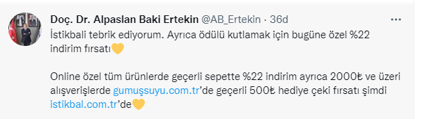 "İstikbali tebrik ediyorum. Ayrıca ödülü kutlamak için bugüne özel %22 indirim fırsatı Online özel tüm ürünlerde geçerli sepette %22 indirim ayrıca 2000₺ ve üzeri alışverişlerde http://gumuşsuyu.com.tr’de geçerli 500₺ hediye çeki fırsatı şimdi http://istikbal.com.tr’de"