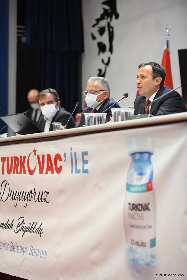 Büyükşehir Belediyesi ocak ayı meclis toplantısı, Büyükşehir Belediye Başkanı Memduh Büyükkılıç'ın başkanlığında gerçekleştirildi. Erciyes Üniversitesi Rektörü Prof. Dr. Mustafa Çalış ile Erciyes Üniversitesi Aşı Araştırma ve Geliştirme Uygulama ve Araştırma Merkezi Müdürü ve Tıp Fakültesi Tıbbi Mikrobiyoloji Anabilim Dalı Öğretim Üyesi Prof. Dr. Aykut Özdarendeli Meclis Toplantısı'na onur konuğu olarak davet edildi. Meclis toplantısında, 'Milli aşımız Turkovac ile gurur duyuyoruz' pankartı açılırken, Başkan Büyükkılıç, Turkovac aşısının gündemde kalması için katkı sağlamaya devam ettiklerini belirterek, "Yerli ve milli olma anlayışı içerisinde Erciyes Üniversitemizin kıymetli ekibinin yapmış olduğu çalışma Turkovac aşısı, emsalleriyle mukayese edilmeyecek şekilde olumlu yönde etkiye sahip olup, uygulamaları başlamış, her geçen gün de bu konu ile ilgili gündemde yer almaktadır. Kayseri Büyükşehir Belediye Meclisi olarak bilim adamlarımızı hem misafir edelim, hem onure edelim hem de sahip çıkarak, Turkovac aşımızın gündemde kalması yönünde Kayseri Büyükşehir Meclisi olarak katkı sağlama yaklaşımı içerisinde bir çalışma yaptık" diye konuştu.