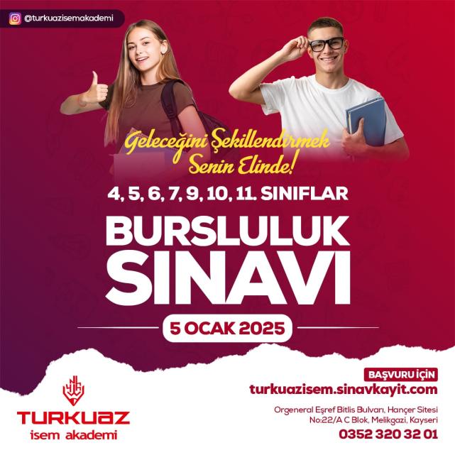 Turkuaz İsem Akademi, 5 Ocak tarihinde öğrenciler için bursluluk sınavı gerçekleştirecek. 4, 5,6,7,9,10 ve 11. sınıflar için düzenlenecek sınavın başvuruları 4 Ocak’ta sona erecek.5 Ocak tarihinde yapılacak sınav öncesi Turkuaz İsem Akademi Yönetim Kurulu Başkanı Eğitimci Hacı Mehmet Muhtar, öğrencilere çağrıda bulunarak, “Turkuaz İsem Akademi ailesi olarak geleceğimizin teminatı çocuklarımız için bursluluk sınavı düzenliyoruz. 6 Aralık’ta başlayan başvuru süreci 4 Ocak tarihinde son bulacak. Ülkemizin aydınlık gelecekleri için 5 Ocak tarihinde düzenleyeceğimiz sınava tüm gençlerimizi bekliyoruz. 4,5,6,7,9,10 ve 11. Sınıf öğrencileri hayallerine ilk adımı atmak için katılacağı sınava Turkuaz İsem Akademi farkı ile kazanmaya hazır olsunlar. Ayrıntılı bilgi için 0352 320 32 01 numaralı telefondan bizlere ulaşabilirler. Güzel bir gelecek için öğrencilerimizi bursluluk sınavına bekliyoruz. Bu fırsat geleceğinizi değiştirebilir...” dedi.