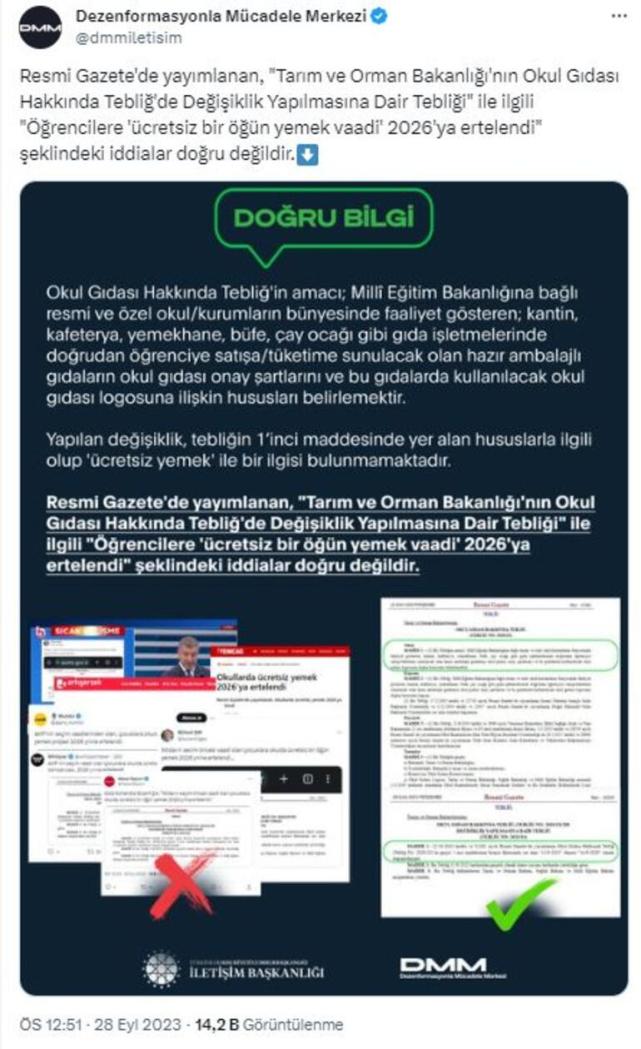 Dezenformasyonla Mücadele Merkezi'nin sosyal medya hesabından yapılan açıklamada, söz konusu iddianın doğru olmadığı belirtilerek, "Okul Gıdası Hakkında Tebliğ'in amacı; Milli Eğitim Bakanlığı'na bağlı resmi ve özel okul/kurumların bünyesinde faaliyet gösteren; kantin, kafeterya, yemekhane, büfe, çay ocağı gibi gıda işletmelerinde doğrudan öğrenciye satışa/tüketime sunulacak olan hazır ambalajlı gıdaların okul gıdası onay şartlarını ve bu gıdalarda kullanılacak okul gıdası logosuna ilişkin hususları belirlemektir. Yapılan değişiklik, tebliğin 1'inci maddesinde yer alan hususlarla ilgili olup 'ücretsiz yemek' ile bir ilgisi bulunmamaktadır" denildi.
