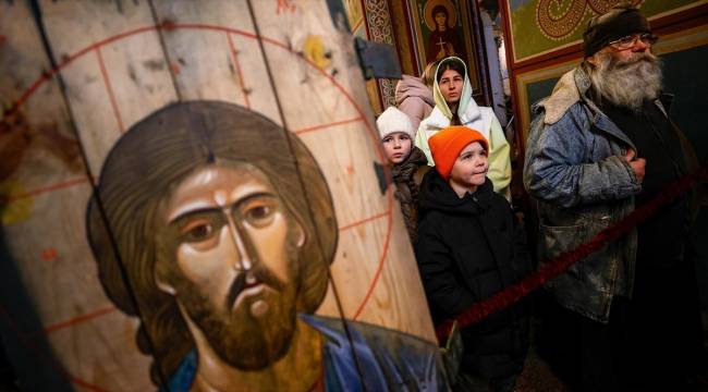 Ukrayna'nın başkenti Kiev'de Aziz Michael Altın Kubbeli Katedrali'nde düzenlenen törenle, ülke genelinde çatışmaların yaşandığı bölgelerde bulunan mühimmat kutularının tahtalarından yapılan ve Hristiyanlar için kutsal sayılan dini tablolar tanıtıldı.