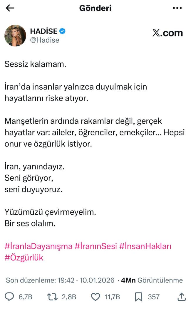 Hadise, paylaşımında İran’da insanların yalnızca seslerini duyurabilmek için hayatlarını riske attığını belirterek, yaşananların istatistiklerden ibaret olmadığını, gerçek hayatlara dokunduğunu ifade etti. “İran, yanındayız. Seni görüyor, seni duyuyoruz. Yüzümüzü çevirmeyelim” sözleriyle İran halkına destek verdi.
