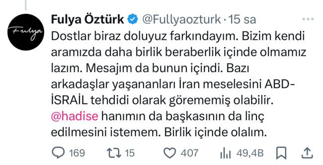 Bu mesaj kısa sürede geniş yankı uyandırırken, gazeteci Fulya Öztürk’ün yanıtı tartışmayı farklı bir boyuta taşıdı. Öztürk, Hadise’nin Gazze konusunda sessiz kaldığını hatırlatarak, Orta Doğu’da yaşananların daha derinlemesine araştırılması ve gelişmelerin yakından takip edilmesi gerektiğini dile getirdi. Öztürk’ün bu sözleri sosyal medyada yoğun şekilde tartışıldı.