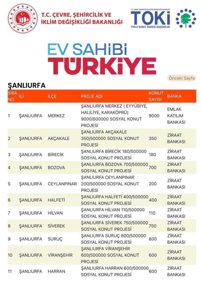 TOKİ’nin “Yüzyılın Konut Projesi” kapsamında 500 Mahalle Konağı inşa edeceğinin duyurulmasının ardından, Şanlıurfa için kapsamlı bir çağrı yapıldı. Ali Eroğlu, projeden tüm Urfa ilçelerinin eşit şekilde yararlanması gerektiğini belirterek her ilçeye en az 500 konut kontenjanı verilmesinin önemini vurguladı.