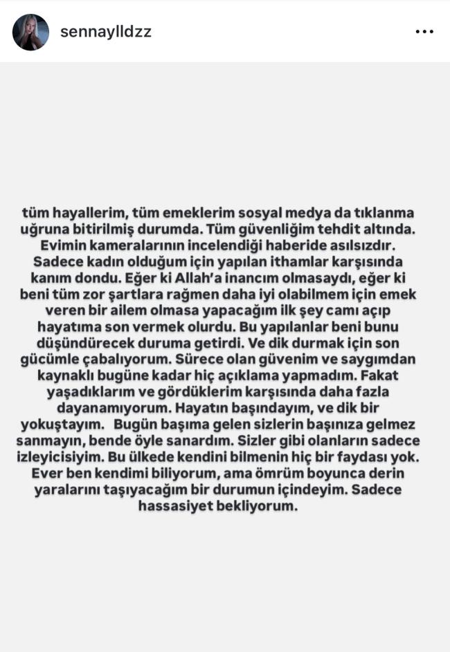 Sosyal medya hesabından uzun bir açıklama yapan Mümine Senna Yıldız, hakkında çıkan haberlerin gerçeği yansıtmadığını savundu. Yıldız, sürecin kendisini psikolojik olarak yıprattığını belirterek, yalnızca kadın olduğu için hedef alındığını düşündüğünü ifade etti. Güvenliğinin tehdit altında olduğunu dile getiren Yıldız, bazı iddiaların da asılsız olduğunu söyledi.