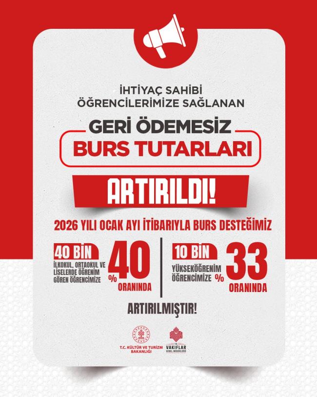 İhtiyaç sahibi öğrencilerimize sağlanan geri ödemesiz burs tutarları artırıldı. Bu kapsamda, 2026 yılı Ocak ayı itibarıyla; İlkokul, ortaokul ve liselerde öğrenim gören 40 bin öğrencimize verilen burs desteğimiz 1.250 TL’den 1.750 TL’ye yükseltildi.